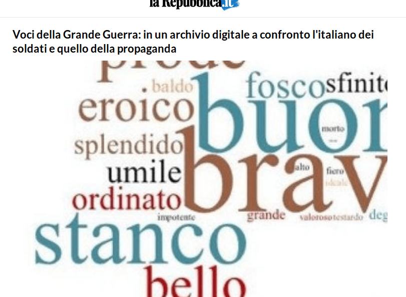 Repubblica ci informa di una bellissima iniziativa “messa a punto dalle università di Pisa e Siena, Cnr e Accademia della Crusca… per la prima volta insieme lettere, diari, scritti di letterati e articoli apparsi sulla stampa nazionale dal 1914 al 1918”.